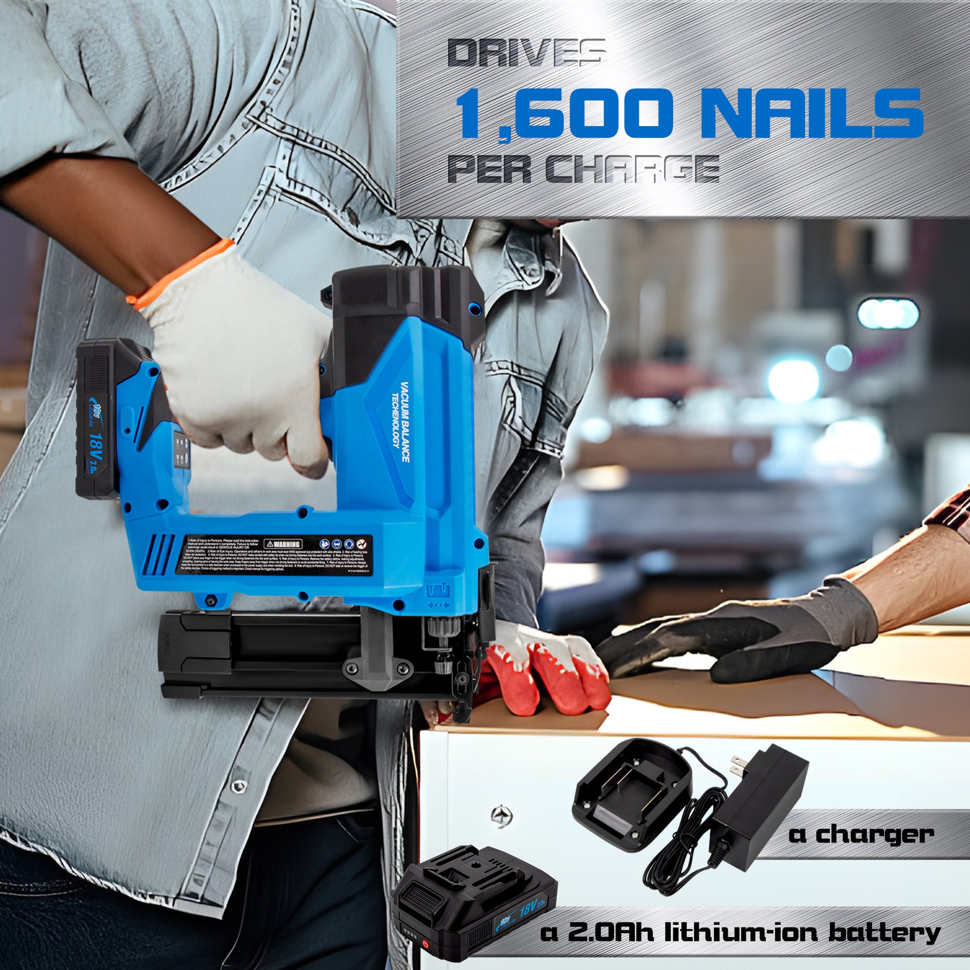 - 【100% Battery Powered】Equipped with an 18V 2.0Ah Li-ion battery, it can drive up to 1,600 nails on a single charge. The wireless design provides flexibility for working anywhere, making it ideal for edge trimming, furniture assembly, floor installation, and interior soft furnishing tasks.